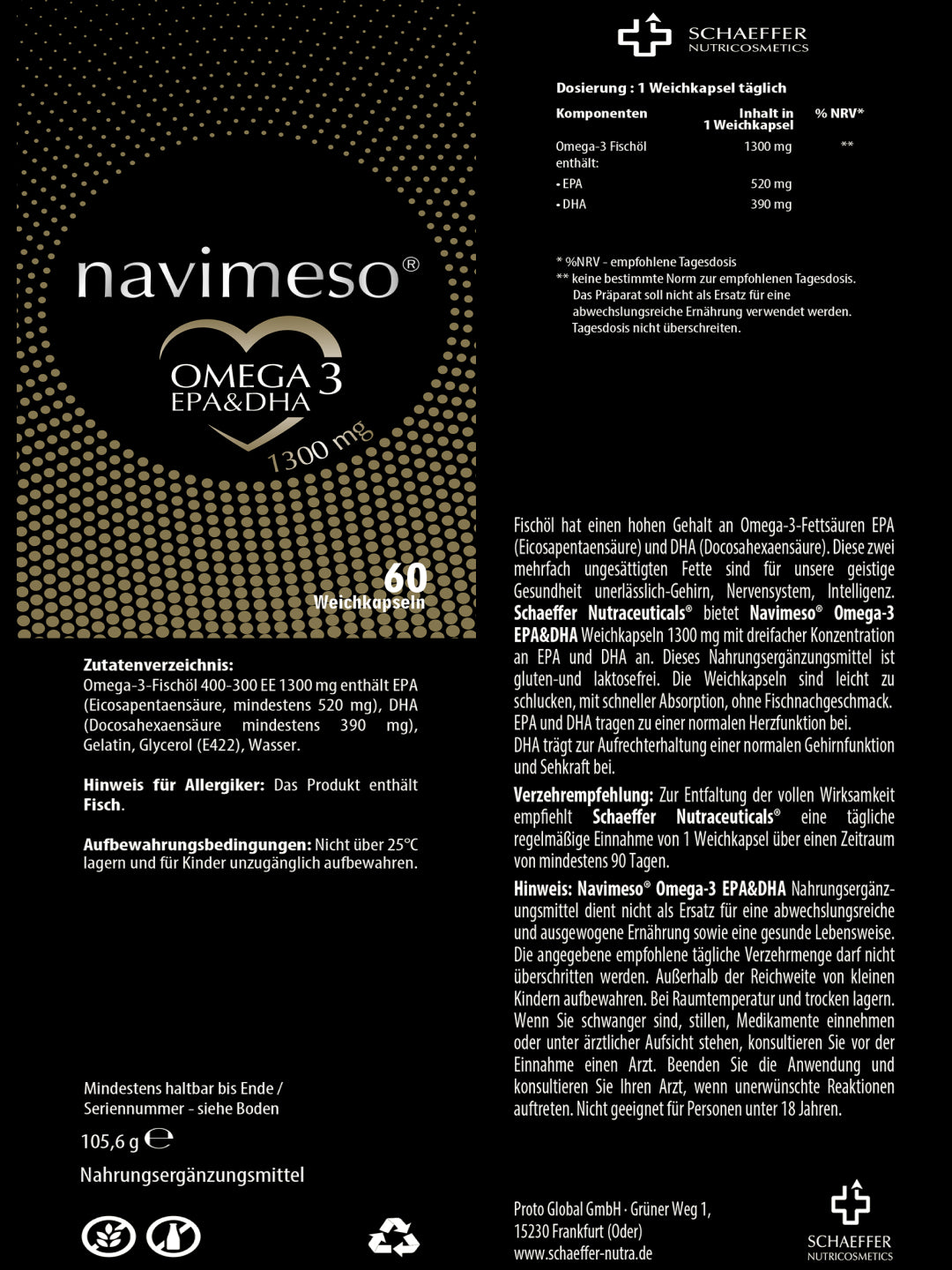 Eine Kapsel NAVIMESO enthält: EPA ≥ 520 mg und DHA ≥ 390 mg.