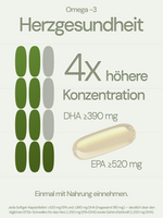 Eine Softgel-Kapsel (EPA ~520 mg + DHA ~390 mg) erfüllt die EFSA-Anforderungen für die Herzfunktion. Für Gehirn und Sehkraft schreibt die EFSA ≥250 mg DHA/Tag vor; unsere Kapsel liefert ~390 mg DHA und erfüllt damit ebenfalls die Vorgabe.
