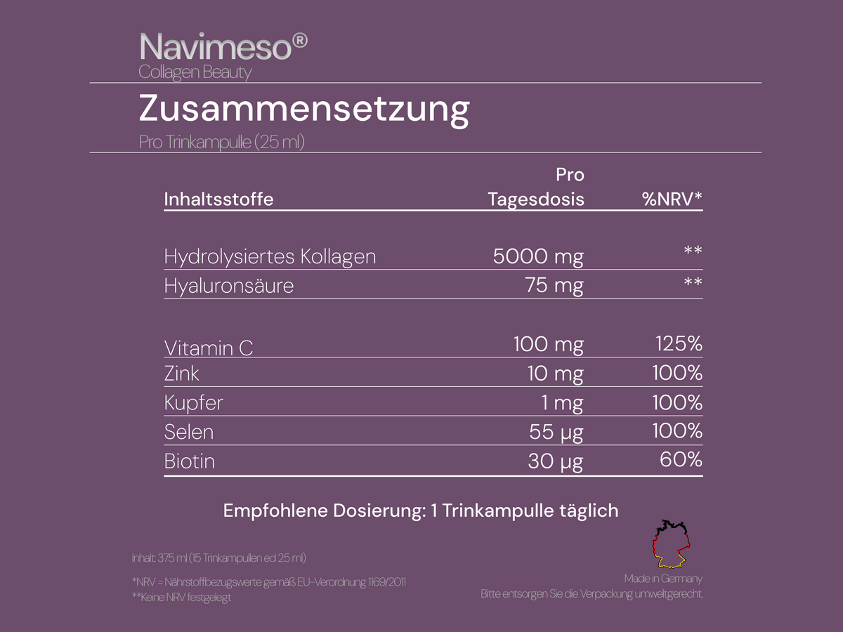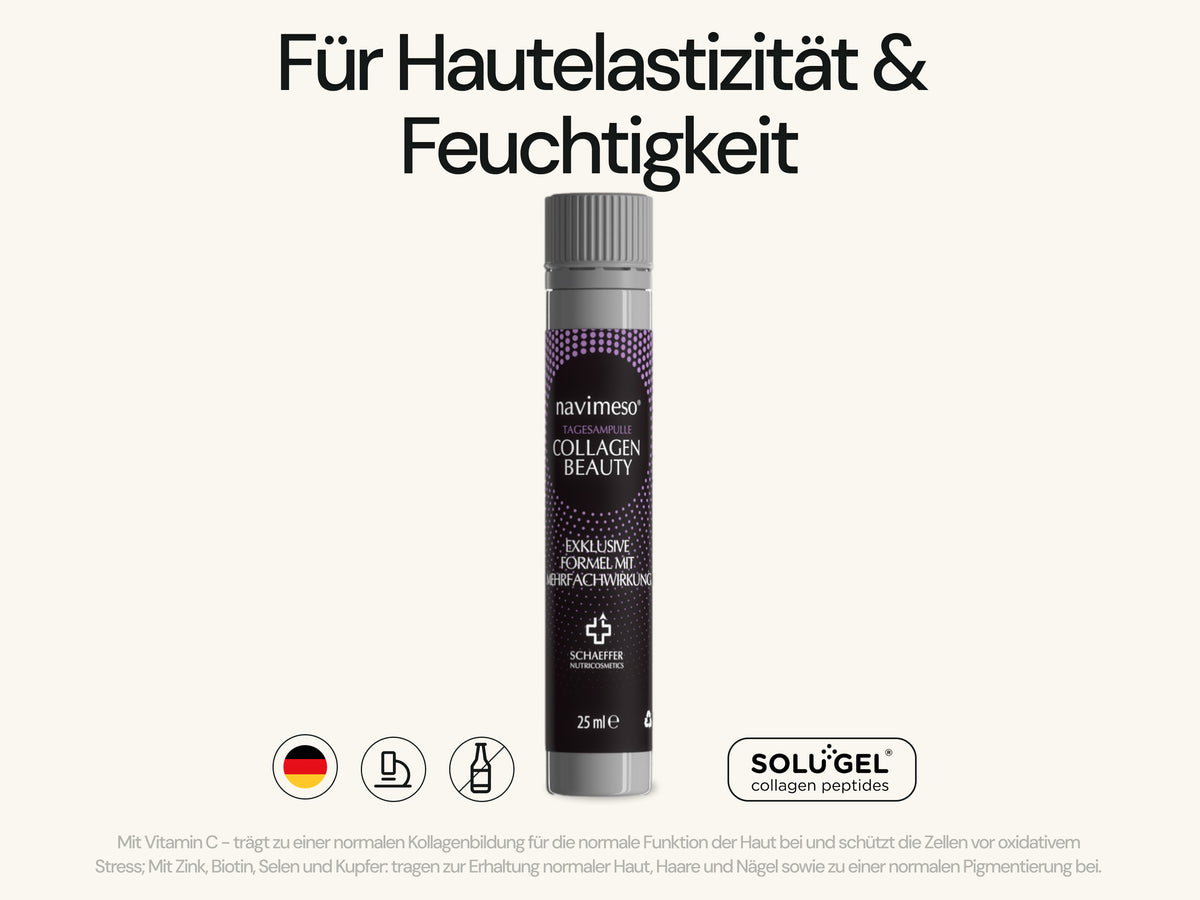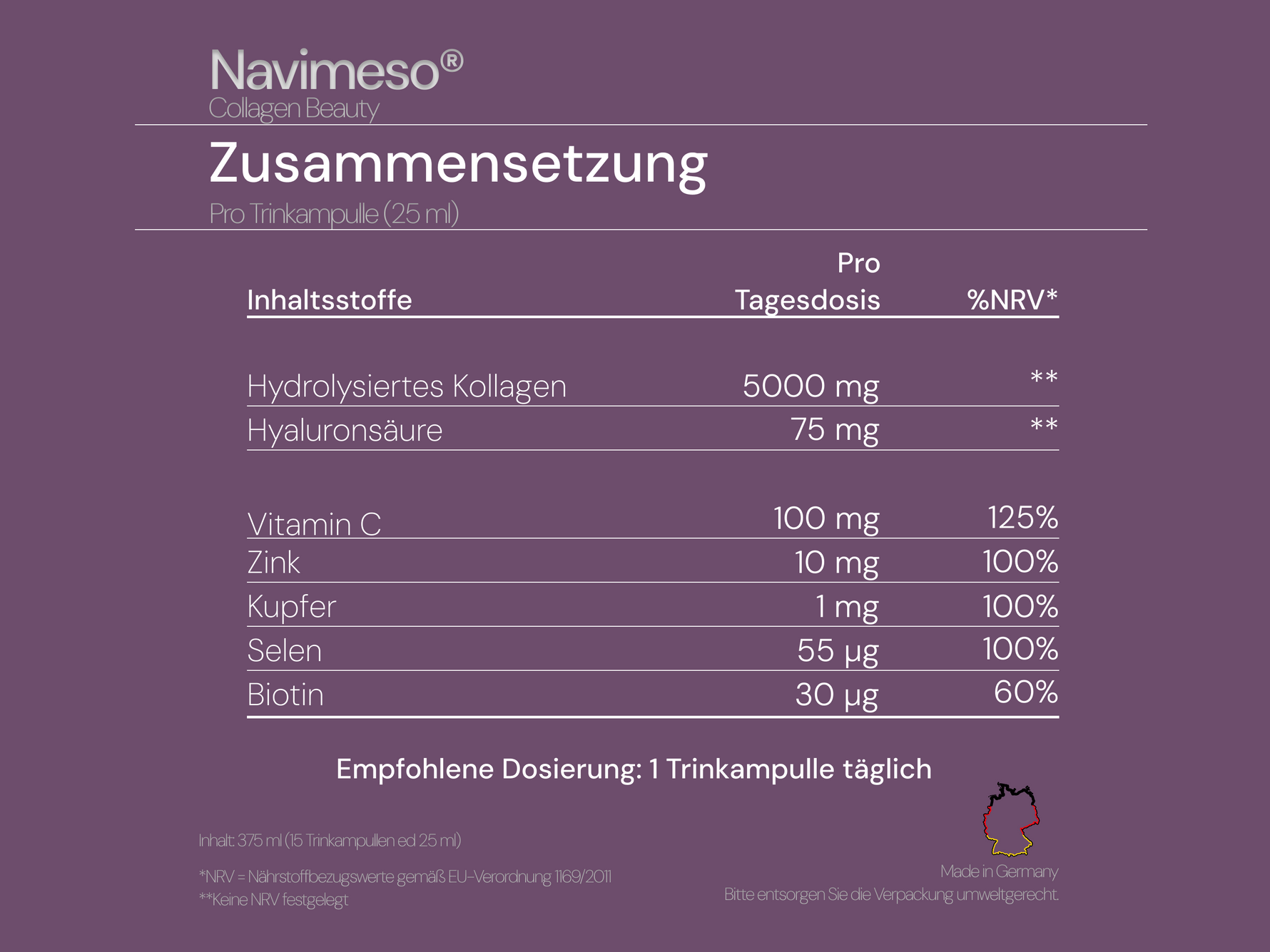 15 ampoules (25 ml each) with clinically tested collagen peptides, biotin and zinc – supports the maintenance of normal skin, hair and nails