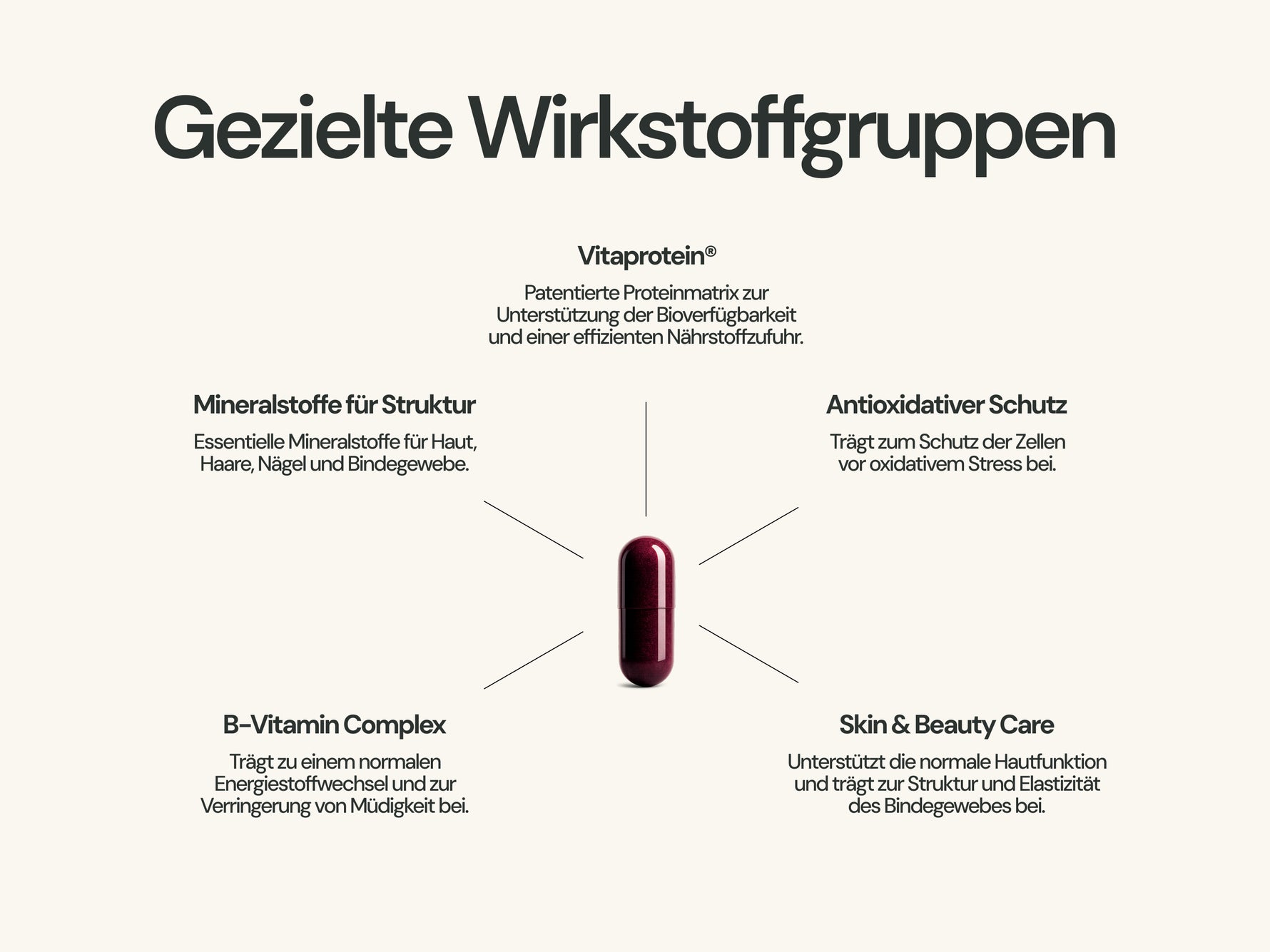 Horsetail extract (Equisetum arvense L., titr. 7% silica); Vitaprotein® (lyophilized egg protein); capsule shell (hydroxypropylmethylcellulose, coloring: carrot concentrate); pyridoxine hydrochloride (vitamin B6); L-ascorbic acid (vitamin C); zinc gluconate; copper gluconate; DL-α-tocopheryl acetate 50% (vitamin E); thiamine hydrochloride (vitamin B1); riboflavin (vitamin B2); nicotinic acid (niacin); β-carotene 10% (provitamin A); pteroylmonoglutamic acid (folate); D-biotin; ferrous fumarate; hydrolyzed collagen; hyaluronic acid; bitter fennel essential oil; maltodextrin; anti-caking agent: silicon dioxide.
