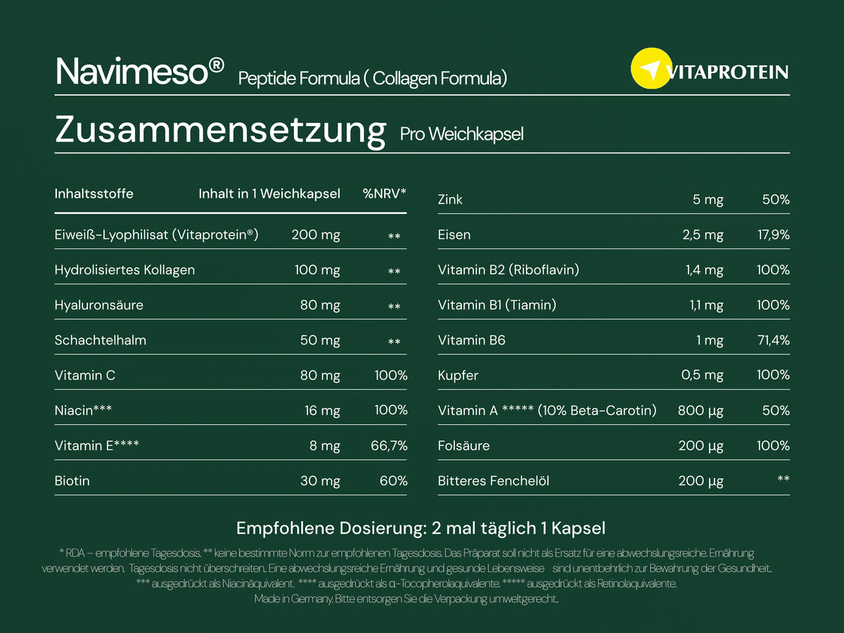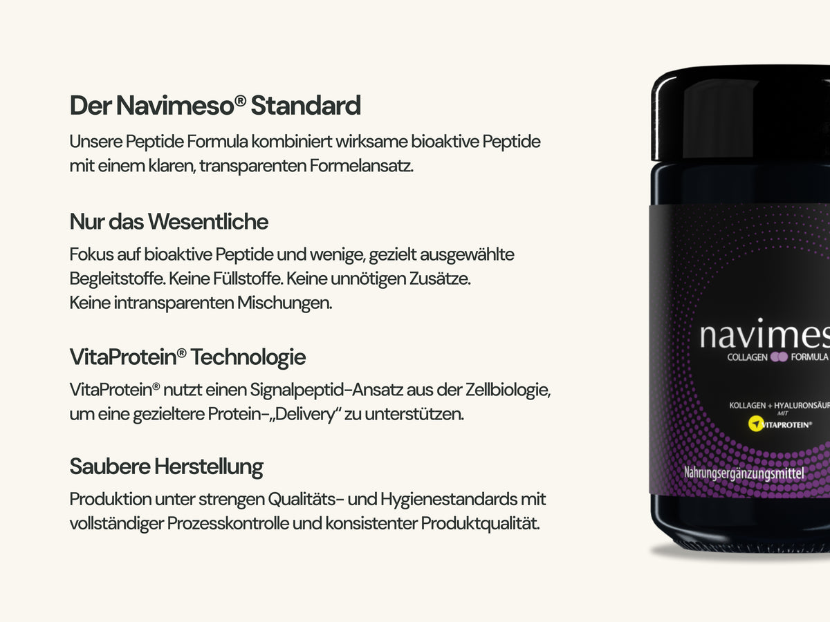 NAVIMESO® Peptide Formula is intended for adults over 18 years of age who want to support the normal condition of skin, hair, and nails and maintain the healthy function of connective tissue. The formula is suitable for people with gluten or lactose intolerance.
